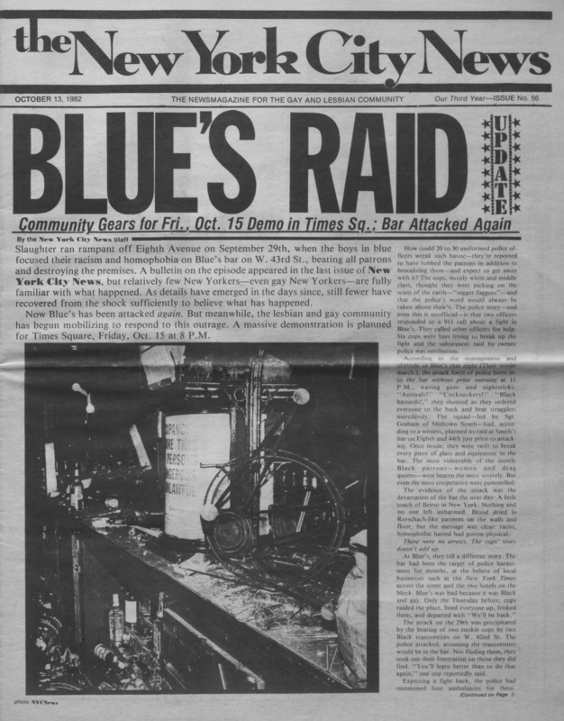 In 1982, as policing of Times Square intensified and plans to redevelop the area began to make headway, the police twice raided Blue’s, a predominantly working-class Black and Latino gay bar that also attracted lesbians and trans people.