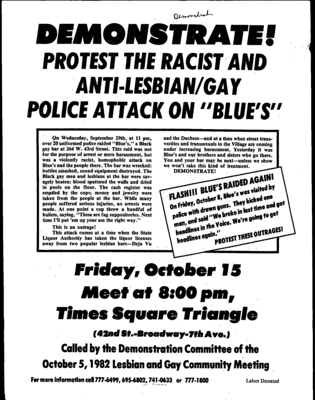 Following the protest, Blue’s remained a rallying point for many activists. The Christopher Street Liberation Day Committee cited Blue’s when it selected the theme “Diversity is Our Strength, Liberation is Our Fight” for the 1983 Pride March and reversed the route to “immobilize” the city. For years, marchers carried placards reading “Remember Blue’s,” a phrase also used by the Anti-Police Abuse Coalition, which groups involved in the demonstration established in 1984 to demand “accountability and community control of the police.”