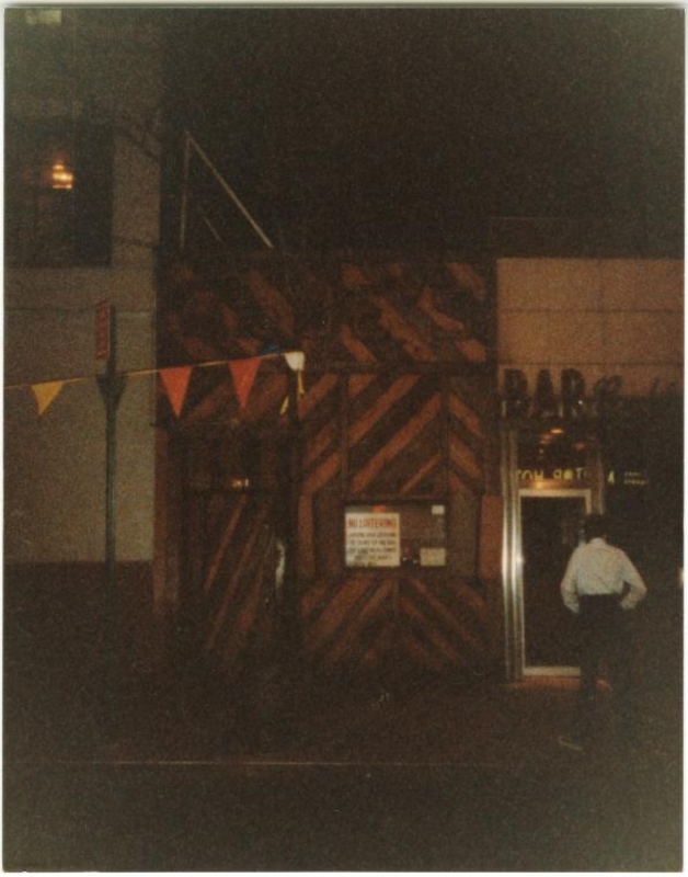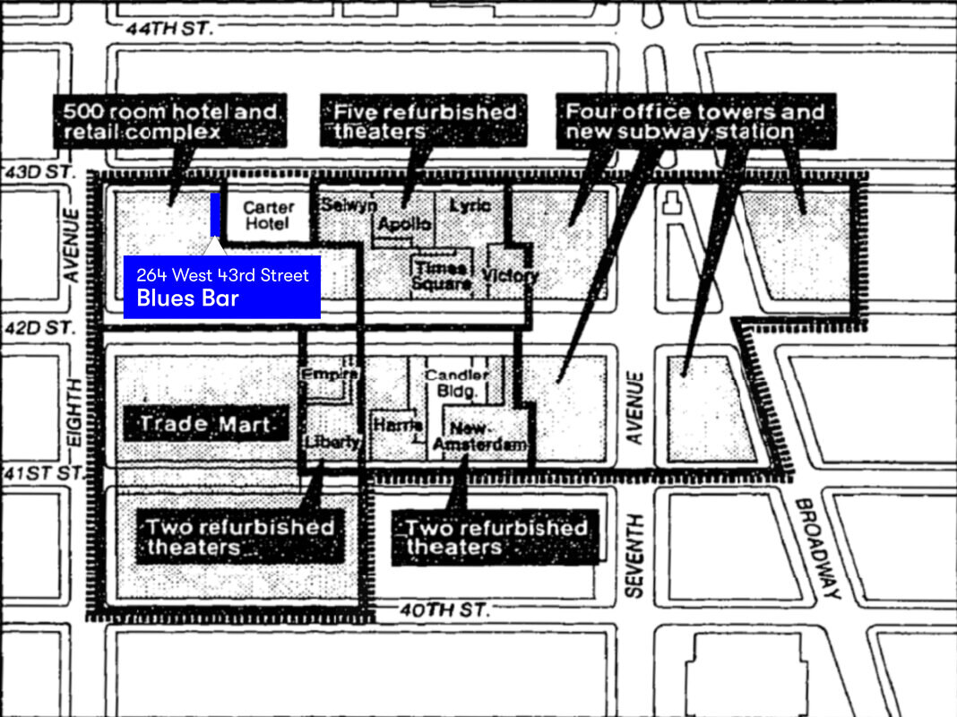Throughout the 20th century, the city recurrently used raids, police sweeps, and other aggressive tactics to “clean up” Times Square, a red-light district and gay enclave that was increasingly viewed as seedy and tawdry. Despite a 1970 protest by the Gay Activists Alliance against such tactics, police harassment persisted in the area into the 1980s. Concurrently, the large-scale demolition and redevelopment of Times Square into a family-friendly tourist destination entered a critical phase in April 1982 when Mayor Ed Koch and the New York State Urban Development Corporation unveiled the 42nd Street Redevelopment Plan. Amid these renewal efforts, police raided Blue’s, a Black and Latino LGBT bar that opened around 1980 in a single-story building at 264 West 43rd Street (demolished), which gay bars Walter’s Pub and The Den previously occupied.