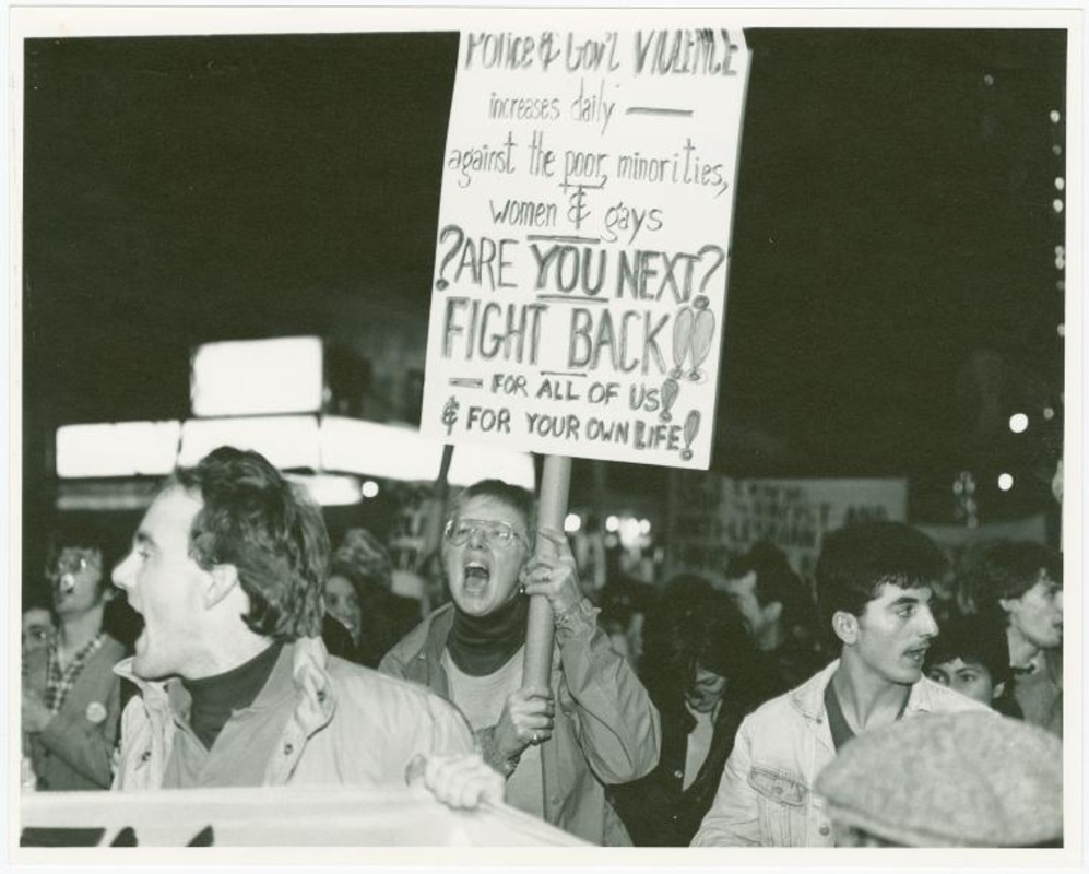In response to the raids, arguably the last LGBT bar raids in New York City’s history, a coalition of interracial LGBT groups organized an anti-police brutality protest in the Times Square neighborhood to call out the media’s silence and condemn the raids as a racist, homophobic effort at moral cleansing and gentrification.