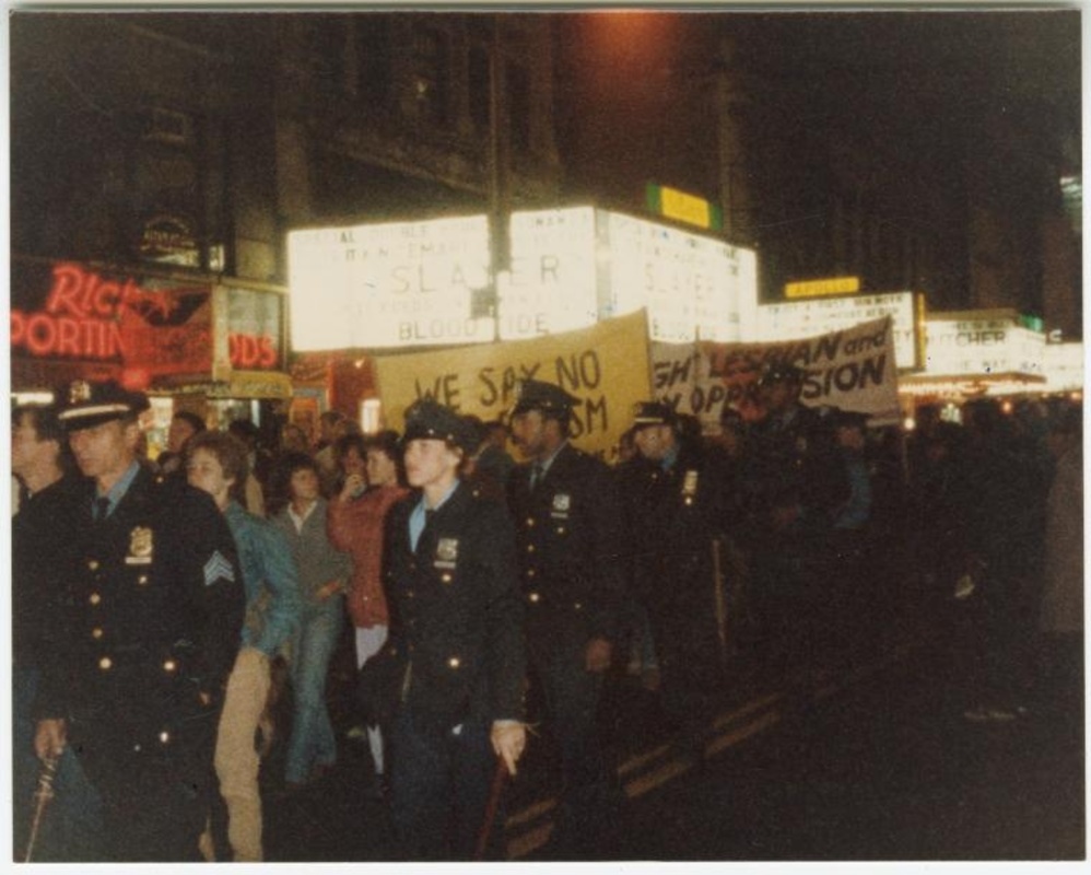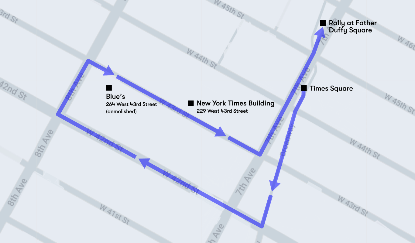 On the evening of October 15, around 1,500 protesters — many holding posters created that day in Blue’s — gathered around a traffic island (now pedestrianized) at Broadway and West 44th Street. After Gwendolyn Rogers and Reverend Magora Kennedy gave speeches outlining the coalition’s demands and likening Blue’s to Stonewall, they and a police contingent headed by openly gay Sergeant Charles H. Cochrane led protesters south on Broadway, west on 42nd Street, north on Eighth Avenue, and east on 43rd Street.