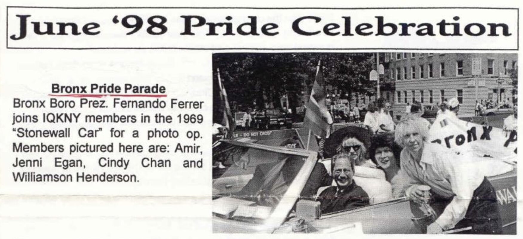 Christine Dinsmore, “Bronx swells with pride,” New York Blade News, July 17, 1998, 9, LGBTQ Collection, Series: Scrapbooks, Box#: 150064 Folder#: 07, LaGuardia and Wagner Archives.