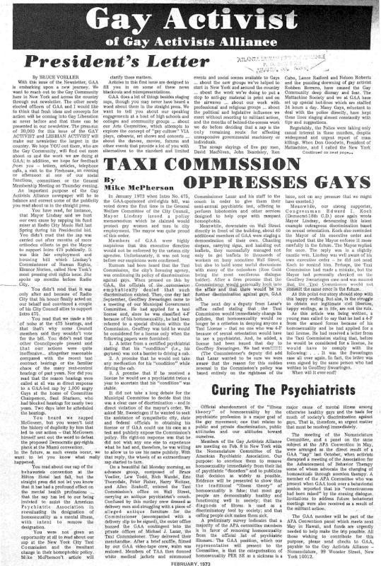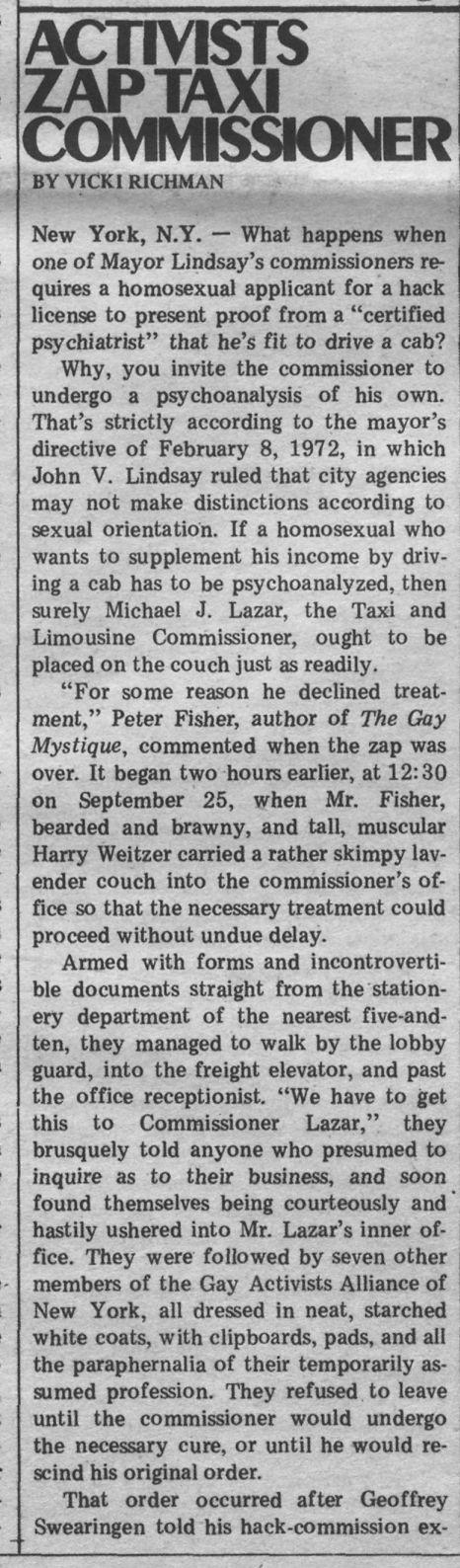 On September 25, 1972, the Gay Activists Alliance zapped the New York City Taxi and Limousine Commission to protest its requirement that LGBT applicants have psychiatric examinations before they could be licensed to drive a vehicle.