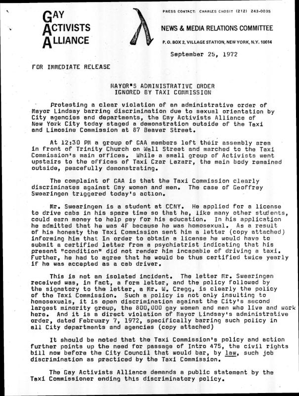 Mayor John V. Lindsay created the New York City Taxi and Limousine Commission (TLC) in 1971 as the agency responsible for licensing and regulating New York City’s taxi cabs and for-hire vehicles. After two years of pressure by the Gay Activists Alliance (GAA) and other LGBT groups for the mayor to take a public stance on LGBT rights issues, on February 7, 1972, Lindsay announced an administrative directive to protect LGBT city employees against discrimination in hiring and promotion. Michael J. Lazar, the TLC commissioner, however, required LGBT applicants to provide proof from a “certified psychiatrist” that they were fit to drive a vehicle. This policy was implemented after Geoffrey Swearingen on September 1, 1972, had admitted that his Selective Service status was 4-F for homosexuality, and was denied a license.