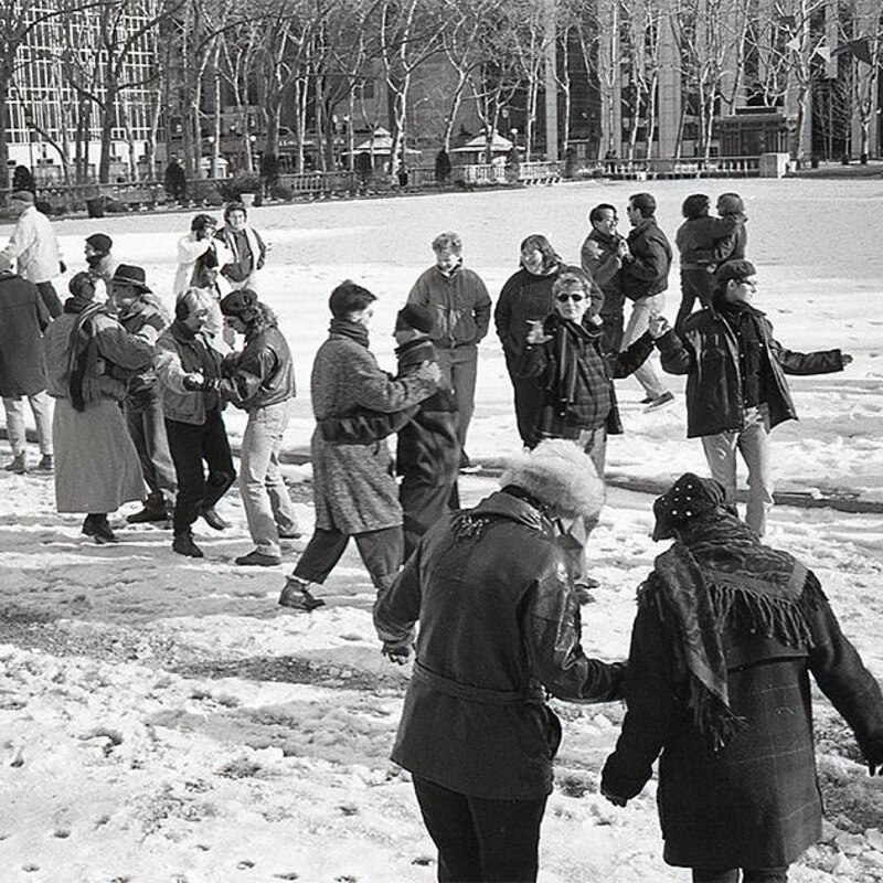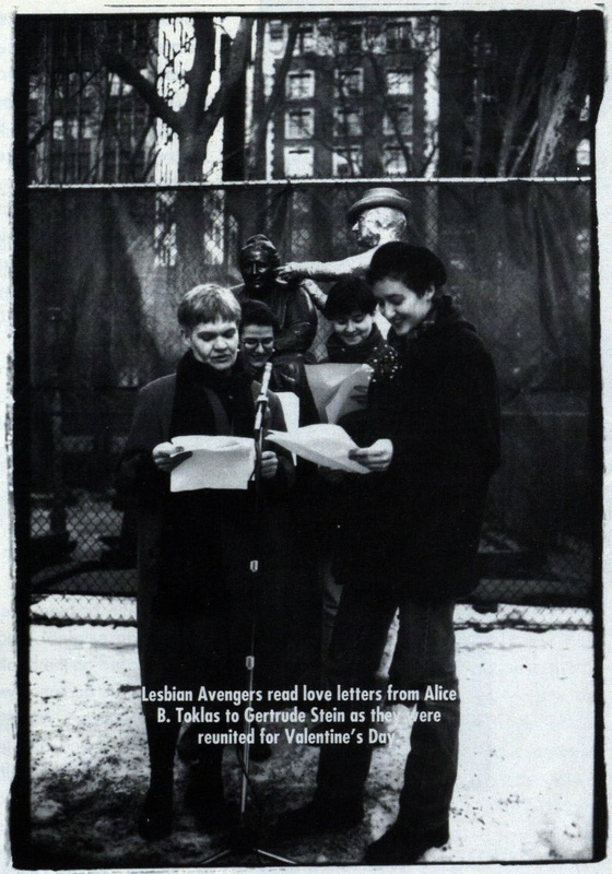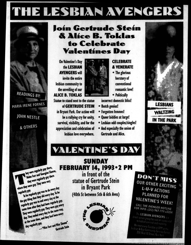 On Valentine’s Day 1993, the year following its dedication, the Lesbian Avengers hosted an action at the monument, in which they “reunited” Stein with Toklas by installing a temporary plaster sculpture of Toklas — handcrafted by the Avengers. Writers Eileen Myles, Jacqueline Woodson, Joan Nestle, María Irene Fornés, Maxine Wolfe, Sarah Schulman, Yvonne Rainer, and others read excerpts of Toklas’ love letters and Stein’s poetry to a crowd of over 200 lesbians, who then danced in a “Lesbian Waltz.” The action, according to the flyer, was intended to “celebrate and venerate the glorious herstory of conventional romantic love, politically incorrect domestic bliss, butch genius, forgotten femmes, queer biddies at large, lesbian odd couples/singles, and especially the union of Gertrude and Alice.”