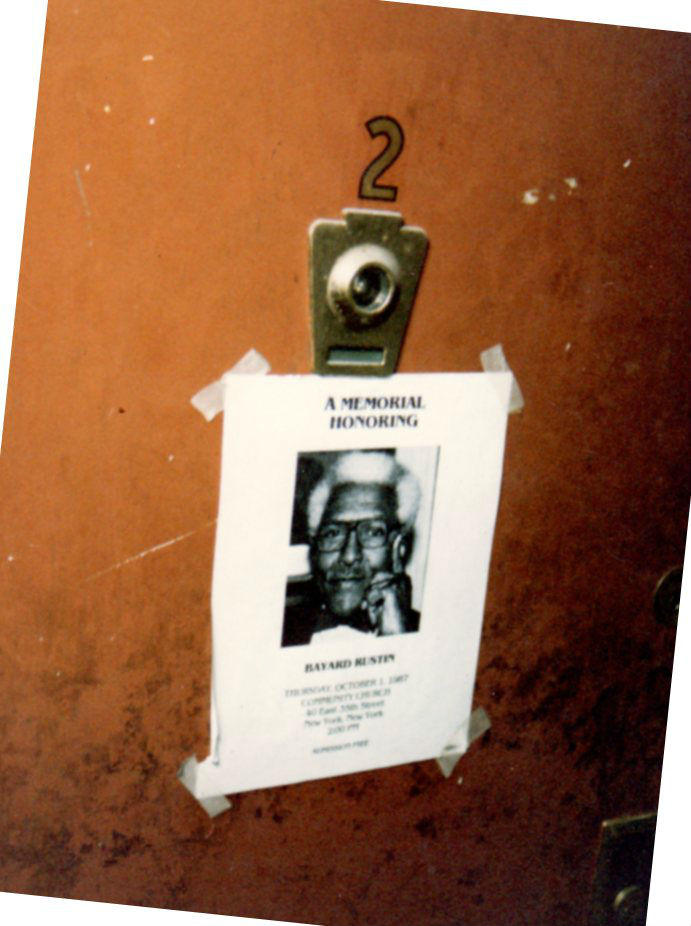 From the 1940s to the 1970s, a commune of artists, radical pacifists, conscientious objectors, and activists lived in a building behind the tenement building at 217 Mott Street on the western edge of the Lower East Side. Two notable gay residents were early civil rights activists, conscientious objectors, and pacifists Igal Roodenko (1917-1991) and Bayard Rustin (1912-1987). Roodenko, a New York City-born Jewish printer by trade, lived on Mott Street from 1947 to at least 1972. Rustin, who would later become Dr. Martin Luther King, Jr.’s chief adviser, resided in apartment 2, on the floor below Roodenko, from 1947 to 1954. The immediate area was home to many young radical thinkers who provided each other with an important sense of community in the post-World War II, anti-Communist years, when dissenters and “outsiders” of any kind attracted suspicion.