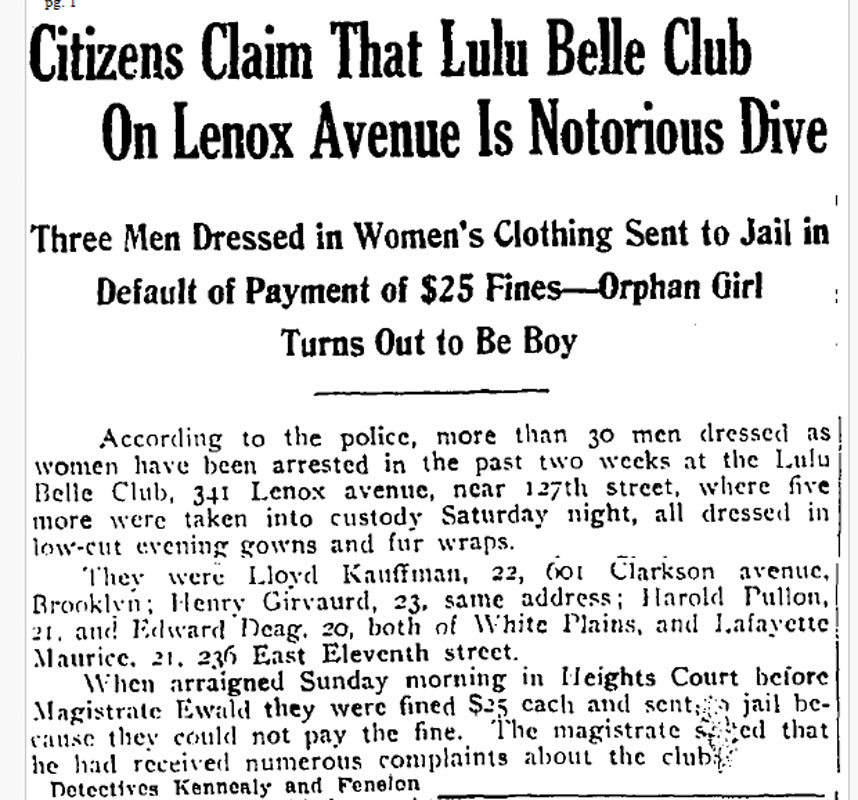The Lulu Belle Club was a late-1920s Harlem supper club that attracted a Black and white working-class clientele and was a hangout for “female impersonators.” Several times in 1928 it was raided by the police, who arrested men and women in one raid, but focused on men in drag in others.