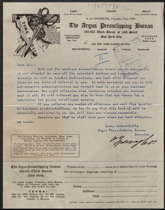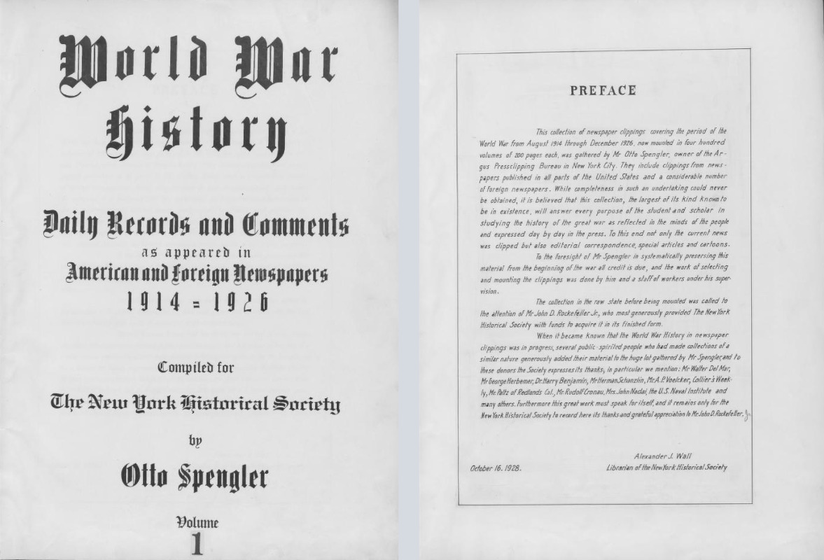 Spengler worked in press clipping — a service that compiles newspaper clippings mentioning customers’ names, products, or subjects — for decades before independently establishing the Argus Pressclipping Bureau in 1902. After 1904, Spengler worked in a second-floor office at 352 Third Avenue — and, later, in the basement — with a rotation of female assistants manually clipping articles for subscribers. Spengler specialized in assembling scrapbooks, including Argus’s crowning achievement: a 400-volume, 80,000-page collection of World War I clippings. The New-York Historical Society (now New York Historical) acquired it in 1928, emphasizing that “The importance of the collection cannot be overestimated…it will make the best contemporary record of the World War to which future historians can turn.” Besides press clipping, Spengler held positions in numerous German-American organizations and, in 1913, compiled an expansive biographical dictionary of New York’s notable German immigrants.