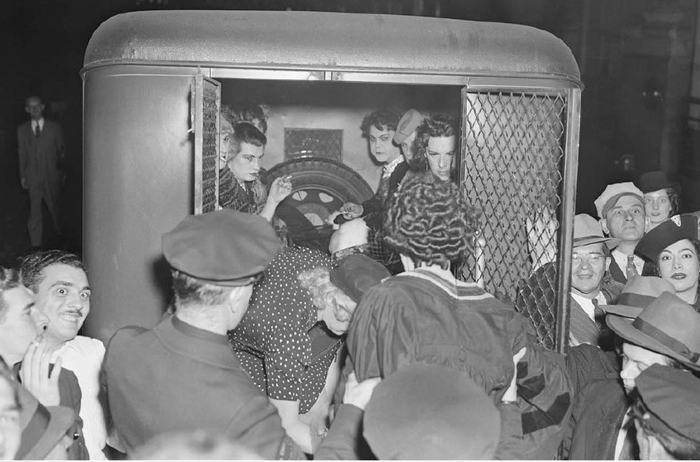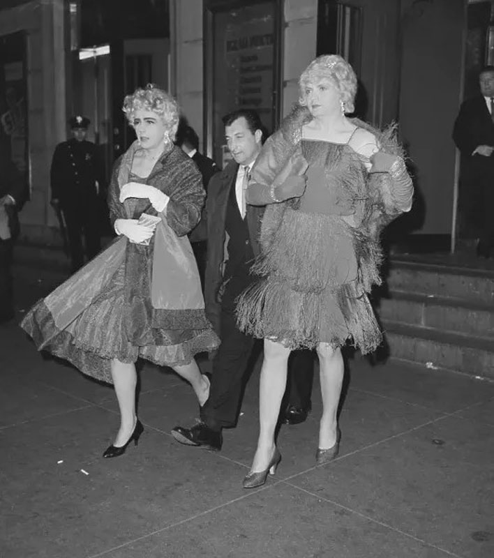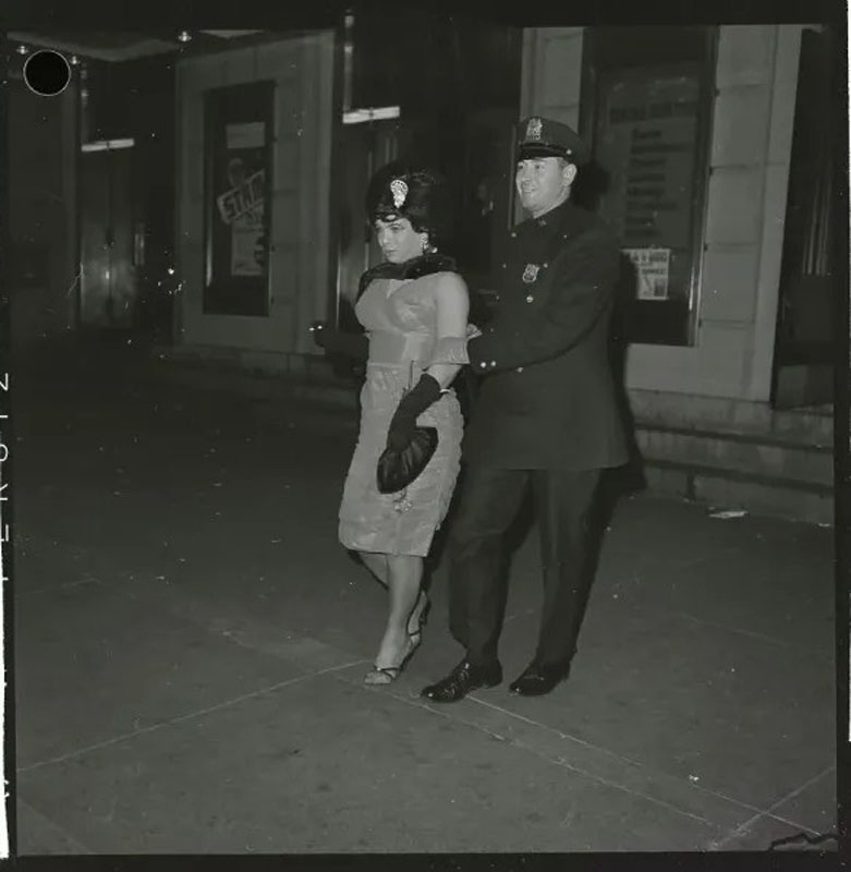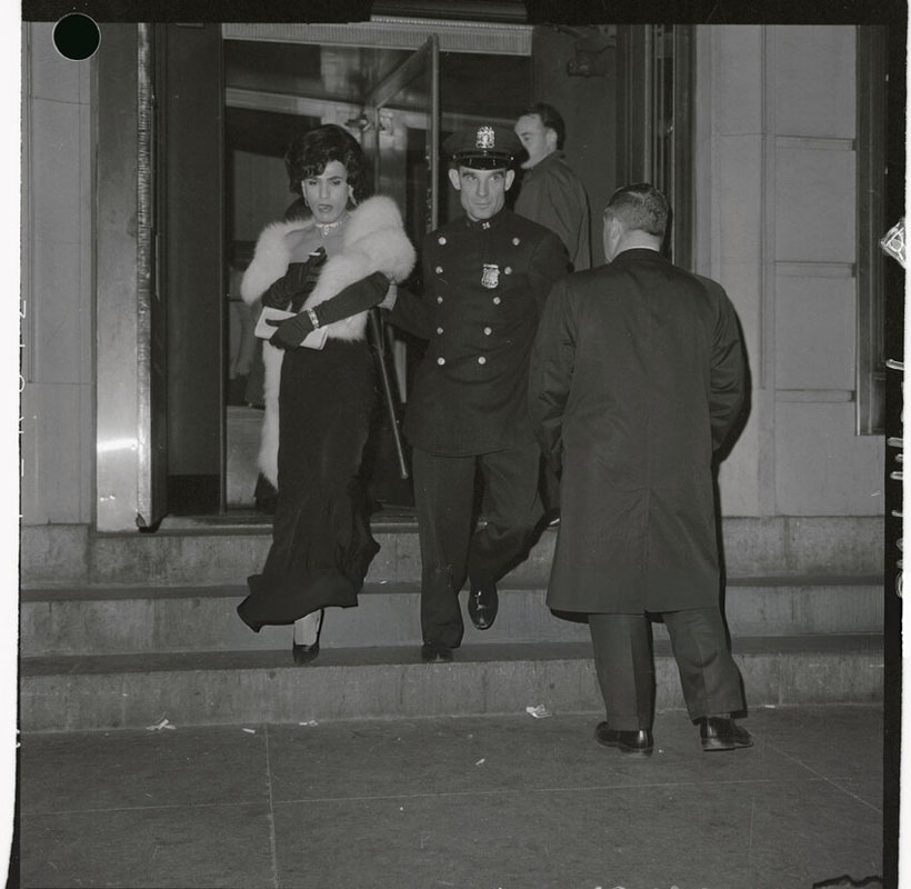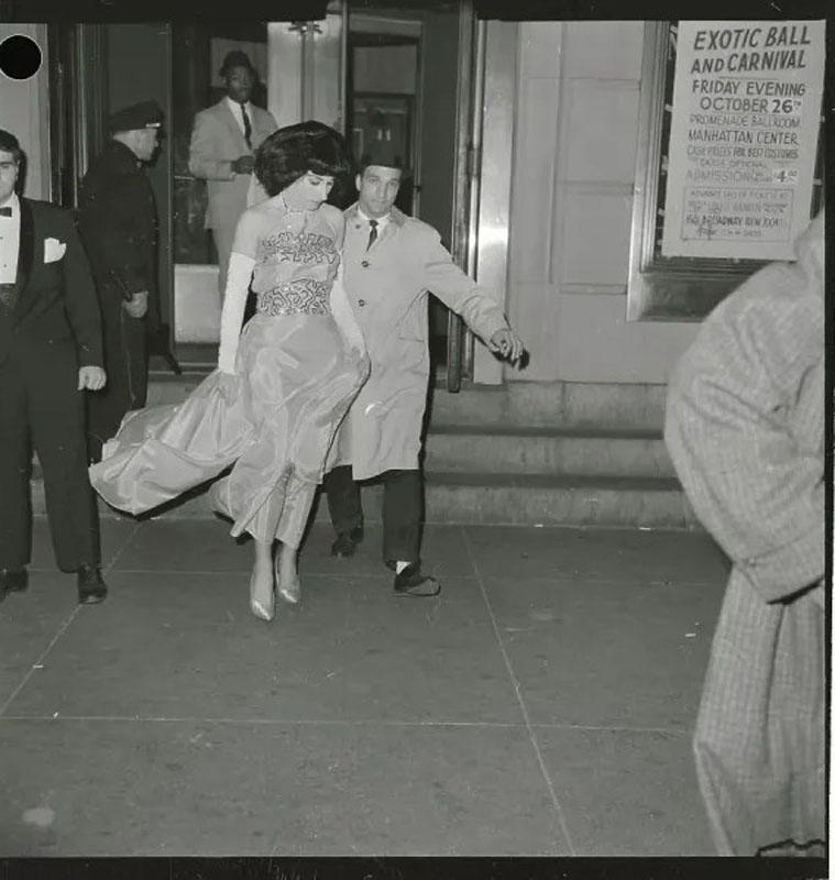 On October 26, 1962, the National Variety Artists’ Exotic Ball and Carnival was held in the grand ballroom of Manhattan Center. This fraternal organization had been formed in 1916 to support vaudeville performers. An annual event since 1937, the Halloween ball was attended by some 2,000 people, and a large crowd on the sidewalk cheered as the costumed guests arrived. New York Police Commissioner Michael J. Murphy happened to be attending another event at the Center, and he personally found the spectacle “disgraceful.” He then led four members of his “Confidential Squad” to conduct a raid of the ball at 10:00 p.m. Forty-four men in drag were arrested — 38 were charged with disorderly conduct under the same statute as the 1939 raid, while six were charged with indecent exposure (wearing bikinis). Curiously, the New York Times reported that detectives insisted that “no policemen had been disguised as women in the operation.” About a dozen photographs of the arrests were taken by a Hearst International News Service photographer.