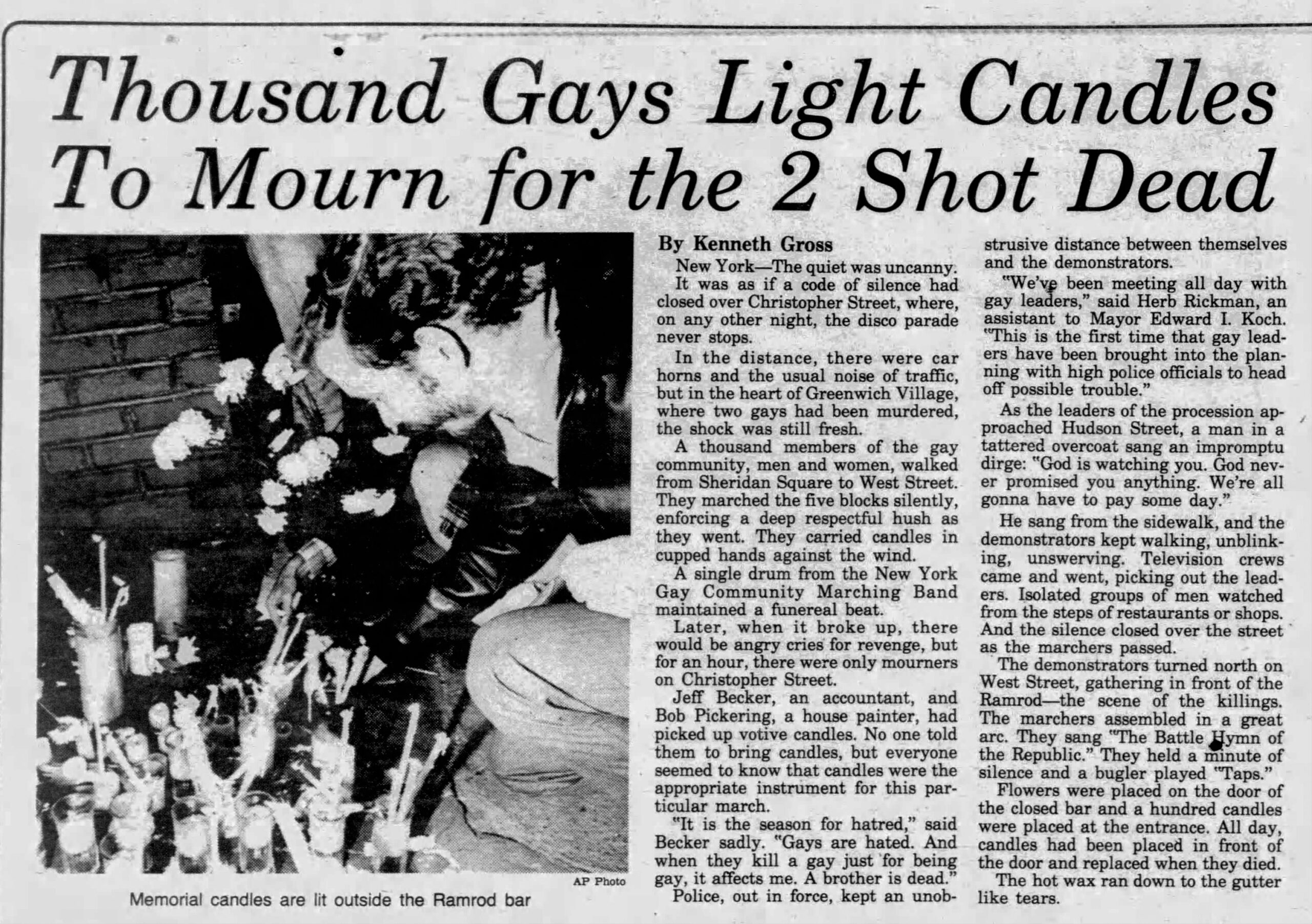 The LGBTQ community was traumatized by the violence of the “West Street Massacre,” as it was called by reporter Andy Humm, in a key social center of the Village. A vigil the following night at Christopher Park was followed by a candlelight procession of some 1,500 people, accompanied by a marching band, to the Ramrod.