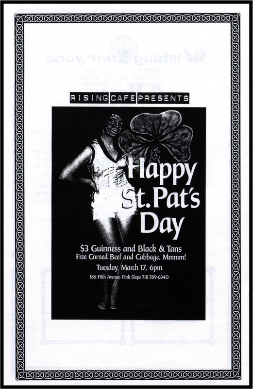 Opened in 1996 by friends Rena Blake (b. 1965) and Christine Marinoni (b. 1967), the Rising Cafe, also known as the Rising, was a popular lesbian Irish pub and coffee shop situated at the edge of Park Slope. They chose the location because the neighborhood had a significant lesbian community at that time. The cafe’s name was likely taken from the 1916 Easter Rising, a pivotal moment of Irish rebellion against British rule that catalyzed the Irish War of Independence.