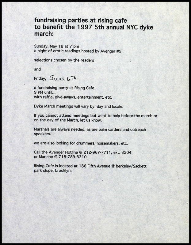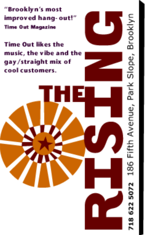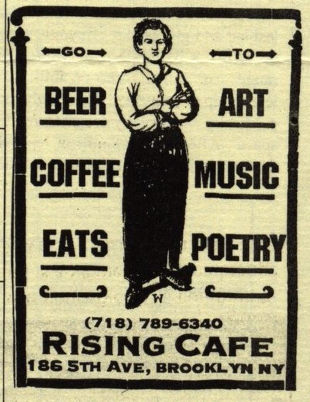 The Rising also became an integral hub for many lesbian groups and organizations, such as the Astrea National Lesbian Action Foundation (ASTREA), the Lesbian Avengers, and the Brooklyn Pride Committee. The May 1999 newsletter Shades, produced by the Brooklyn AIDS Task Force’s Shades of Lavender, noted that the Poets’ Cafe at the Rising that April included readings by Betsy Andrews, Minnie Bruce Pratt, Rachel Levitsky, and Karleen Pendelton-Jimenez, and that “the place was packed with just about every dyke in Park Slope.” Rising Cafe also regularly organized fundraisers and campaigns for both neighboring businesses and residents. It closed in 2003.