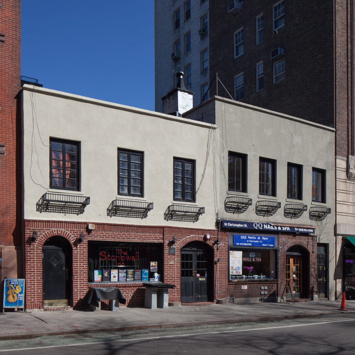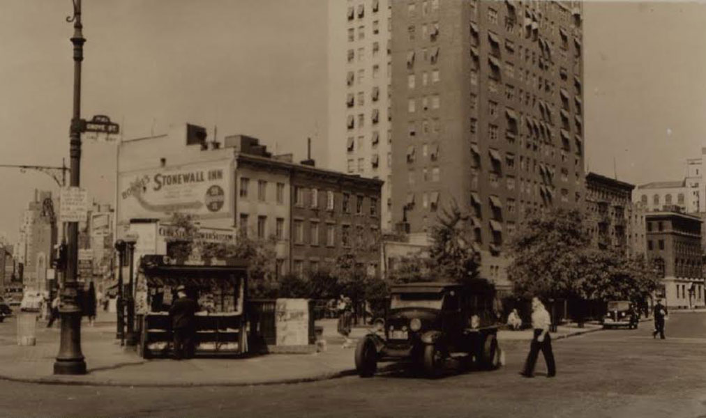 The two buildings were constructed as stables in the mid-19th century. In 1930, they were combined with one façade to house a bakery. In 1934, Bonnie’s Stonewall Inn opened here as a popular Greenwich Village bar and restaurant, and operated until 1964, when the interior was destroyed by fire. In March 1965, the estate that had owned the property for over 150 years sold it, along with five adjacent properties, to Burt and Lucille Handelsman, who were wealthy real estate investors.