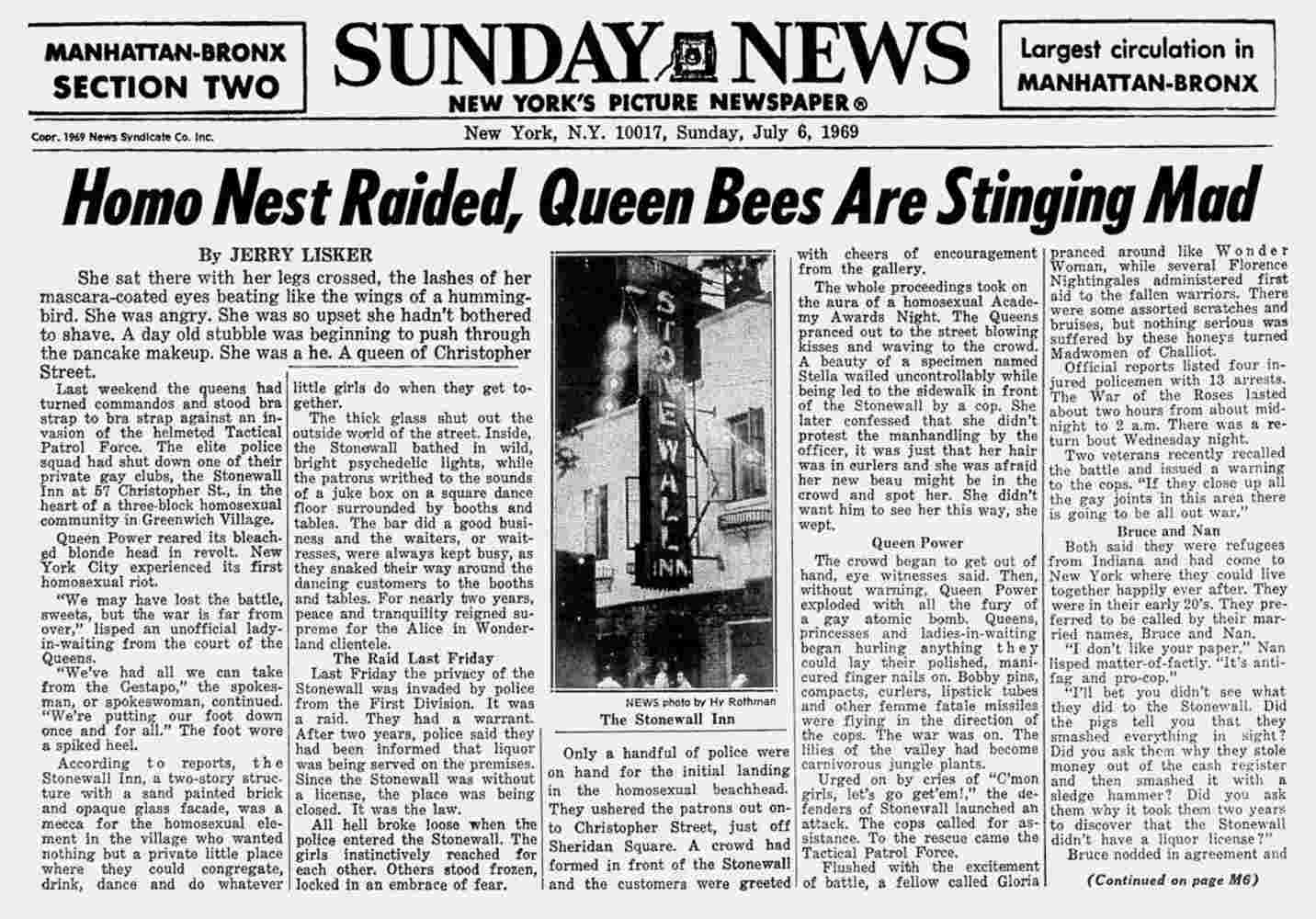 From June 28 to July 3, 1969, LGBT patrons of the Stonewall Inn and members of the local community took the unusual action of fighting back during a routine police raid at the bar.
