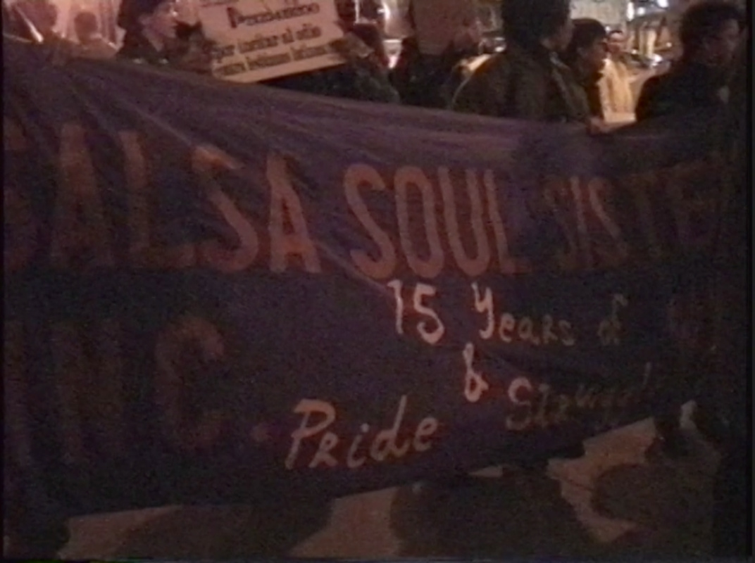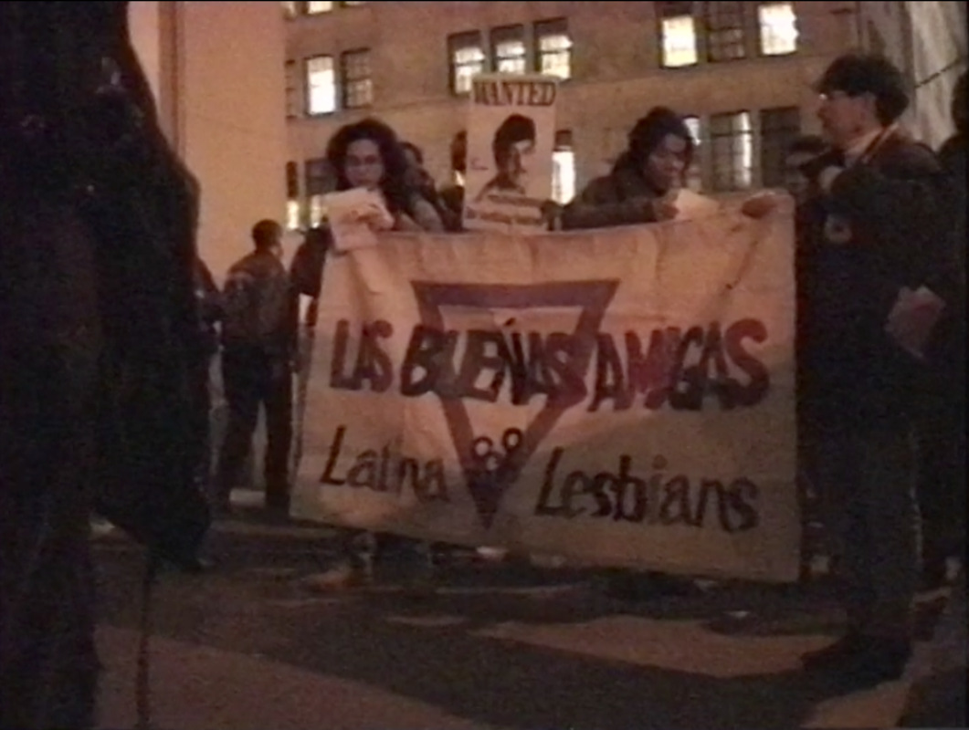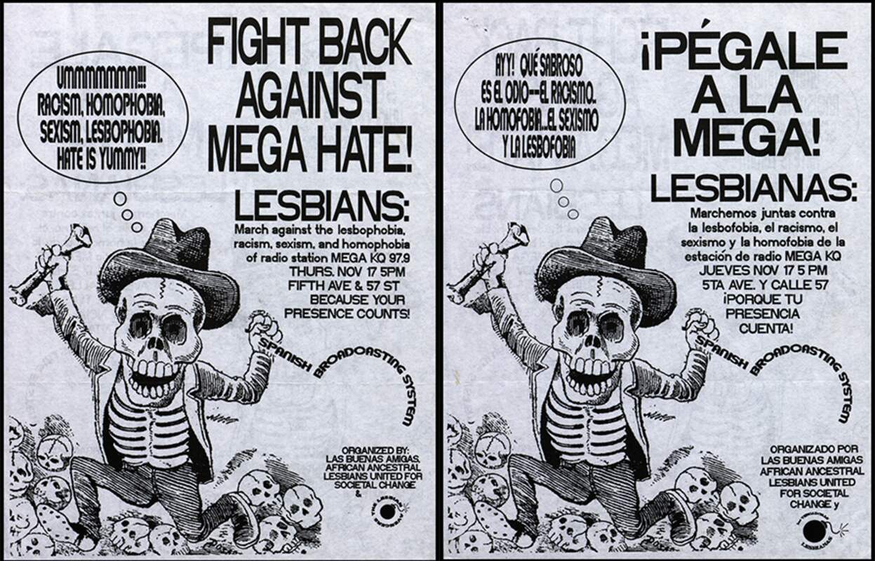 In 1994, activist Ana María Simo of the Lesbian Avengers led an effort “to bring [the Avengers’ work] into the barrios” by mobilizing immigrant, Latina, and working-class lesbians against the hate-mongering tactics of Spanish radio station La Mega 97.9 and its parent company, the Spanish Broadcasting System (SBS), which began leasing 26 West 56th Street as its headquarters and studios in 1988. The hosts of El Vacilón de la Mañana, La Mega’s morning show, regularly insulted and propagated stereotypes about LGBT, Asian, Black, and Jewish peoples, and joked about the rape and domestic abuse of women. In response, the Lesbian Avengers, Las Buenas Amigas, and African Ancestral Lesbians United for Societal Change (formerly Salsa Soul Sisters) formed a coalition and staged multiple demonstrations at SBS after extensive planning at Simo’s apartment.